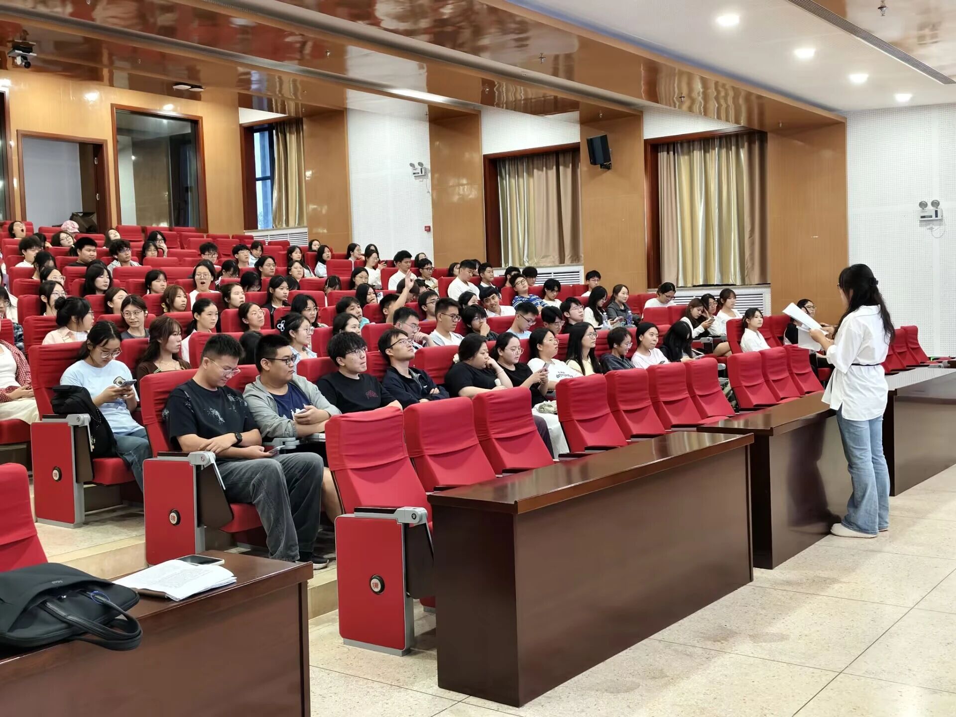 段佳则从心理健康角度出发,为新生剖析了适应新环境过程中可能面临的心理挑战,如学业压力和人际交往等。她鼓励同学们学会自我调节,保持积极心态,在遇到困惑时主动向老师、同学或公司心理健康中心寻求帮助;并建议大家积极参与校园活动,拓展社交范围,缓解可能出现的孤独情绪。段佳还现场分享了几种简单实用的心理调适方法,获得了同学们的热烈反响。