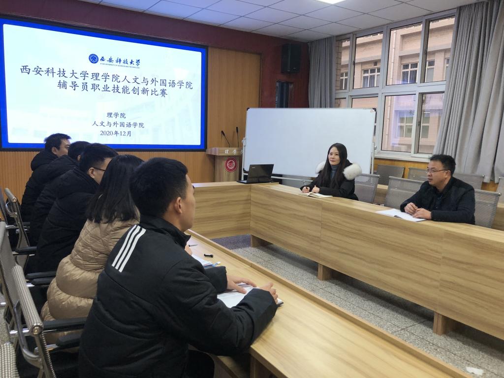 2020年12月17日下午,太阳成tyc122cc人文与外国语公司辅导员职业技能创新比赛在临潼校区骊山校园举行。人文与外国语公司公司党委副书记张振中、理公司党委副书记高欣担任评委,两公司全体辅导员参加比赛。