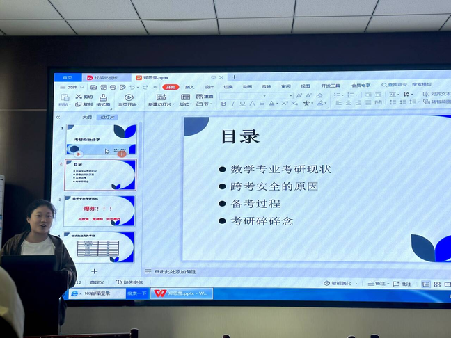 接着,郑思颖同学从跨专业考研角度向同学们介绍了数学专业考研现状、跨考安全专业的原因、备考过程、考试心态四个方面,她鼓励大家早做规划,积极向感兴趣的研究方向靠拢,并为此不断努力。