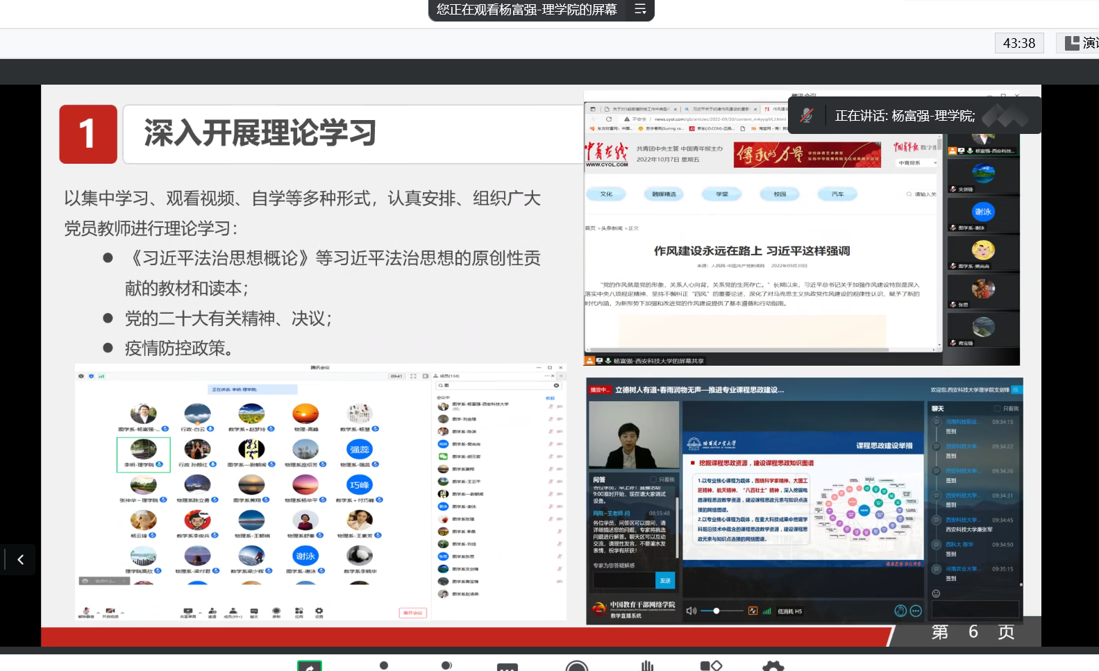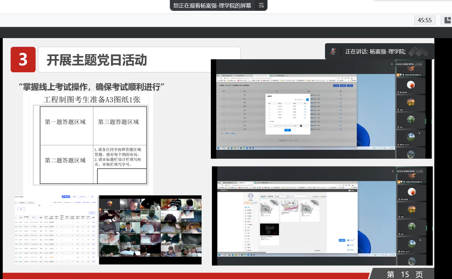 会议第一阶段,6位党支部书记现场述职,1位任职不满1年的党支部书记书面述职。孙颜红对数学系第二党支部、工程图学系党支部,张仲华对物理系党支部、陈伟伯对研究生党支部、力学系党支部,解忧对本科生党支部、李自刚对数学系第一党支部分别进行点评,肯定成绩,指出不足。