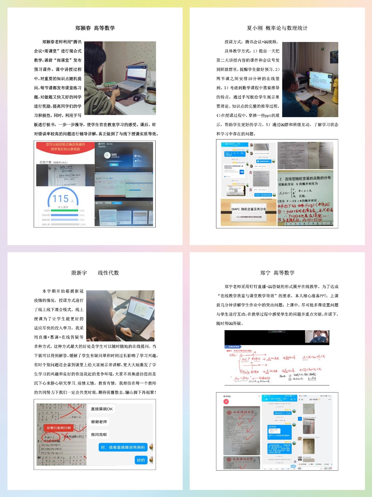 老师们有的自购书写板课堂上板书,一步步推导,一步步演绎,一步步启发,及时互动,同学们反映效果非常好;有的连麦互动,耐心讲解,开展有效教学;有的录制重点题目讲解视频,不分昼夜地为同学答疑解惑;有的通过设置签到、抢答、选答等环节提高同学们的学习积极性;有的利用疫情防控、党的二十大这些现实教材,坚定爱国主义情怀,开展“课程思政”。