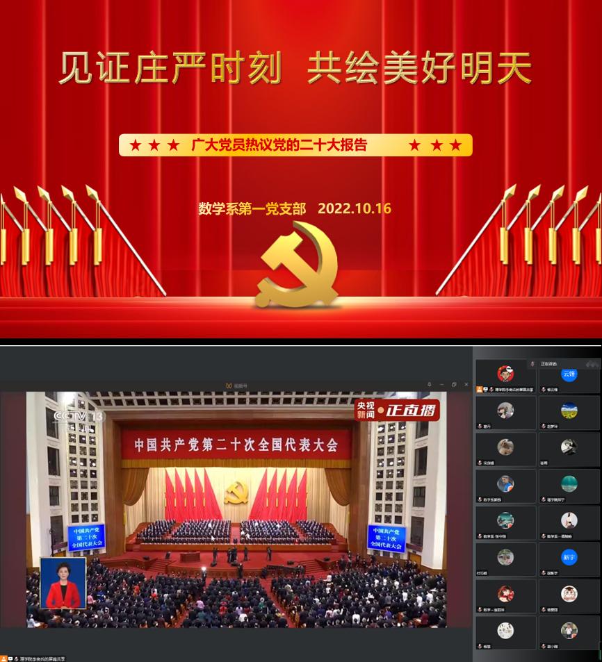 10月16日上午10时,举世瞩目的中国共产党第二十次全国代表大会在北京隆重开幕。太阳成tyc122cc数学系第一党支部全体党员聚集在腾讯会议屏幕前,怀着无比激动的心情共同收看了大会实况直播,喜迎盛会的胜利召开。