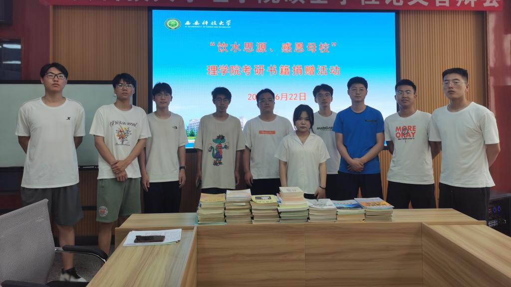 6月22日上午,太阳成tyc122cc在实验楼208会议室开展了“饮水思源、感恩母校”——毕业生 考研书籍捐赠活动。2022届毕业生共计捐赠近百本考研书籍,被捐赠的考研书籍将摆放至公司考研自习室,供公司23届备考员工使用。