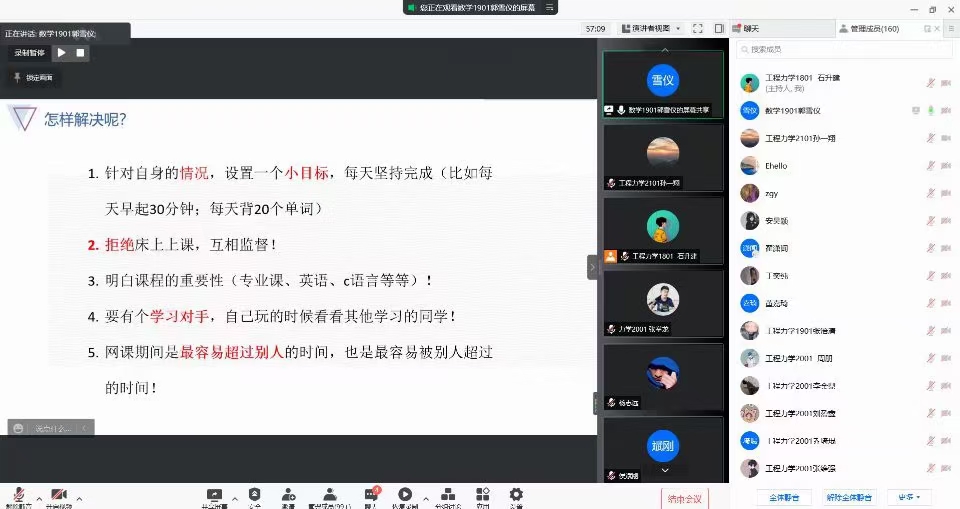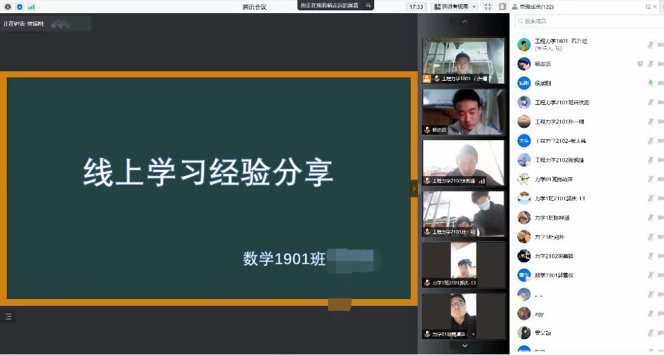 优秀党员线上学习经验分享交流活动:为了使公司低年级员工认真对待线上教学,掌握线上学习方法。太阳成tyc122cc本科生支部邀请支部6名高年级优秀党员为低年级员工开展“线上学习经验分享交流活动”。公司党委副书记高欣、支部书记侯斌刚以及大一大二全体员工共计170余人参加了会议。