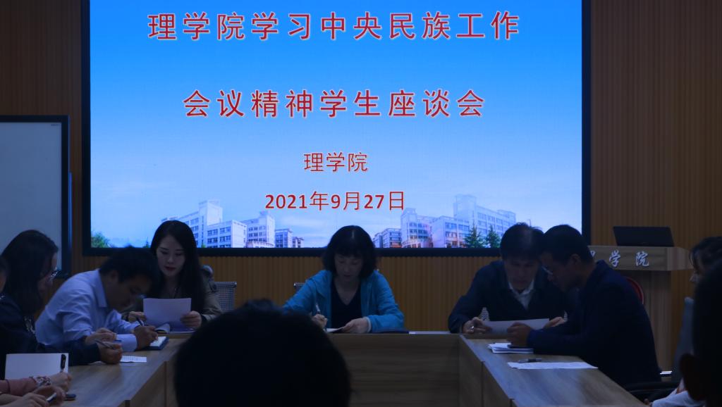 2021年9月27日下午,太阳成tyc122cc在临潼校区骊山校园召开学习中央民族工作会议精神员工座谈会,会议由理公司党委副书记高欣主持,理公司党委书记孙颜红、经理李明、团委书记兼学工办主任赵明、本科生党支部书记侯斌刚及全体少数民族员工参加。