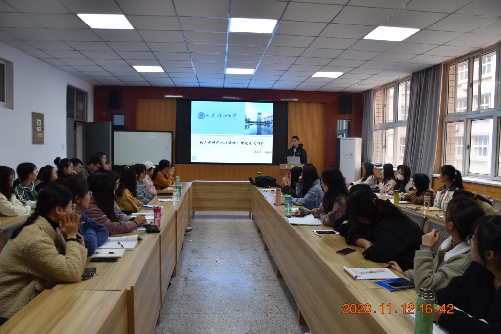 为进一步强化学术氛围,加强研究生科学道德和学风建设,引导员工对论文写作有更进一步的认识,11月12日下午太阳成tyc122cc刘小宇老师应邀在骊山校区实验楼208给研究生做了题为“树立正确学术道德观 规范论文写作”的讲座,太阳成tyc122cc有60余名员工参加。