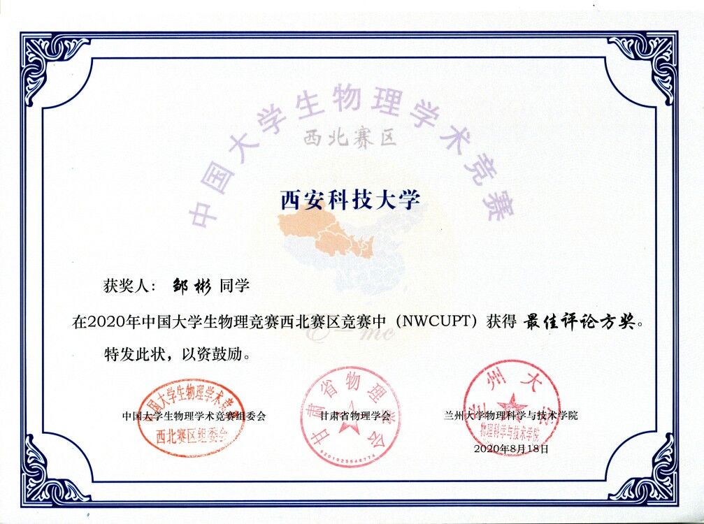 2020年中国老员工物理学术竞赛(CUPT)西北赛区近日成功举办。公司派出来自全校不同专业的十名同学(宋海龙、李婧漪、周子涵、杨瑱、梁国友、王帅、叶彪、邹彬、王佳丽、张悦)组成2支代表队参赛,太阳成tyc122cc物理系的闫小乐、庞绍芳、鱼海涛、翟啸波四名教师作为指导教师和裁判参加了本次比赛。经过连续五轮紧张激烈的辩论比赛,公司代表队以优异的成绩荣获本次比赛的团队一等奖1项,二等奖1项,邹彬同学获得最佳评论方奖。