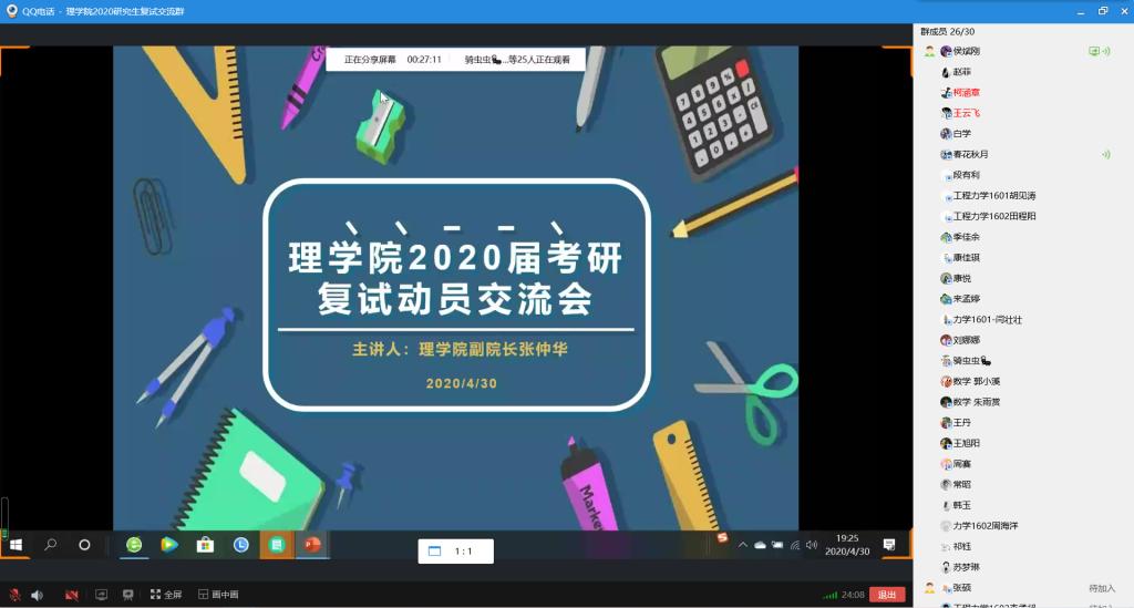 4月30日晚,太阳成tyc122cc召开2020届毕业生考研复试动员交流会,会议通过QQ电话会议召开,公司副经理张仲华、党委副书记高欣、辅导员侯斌刚以及公司全体考研上线员工参加会议。