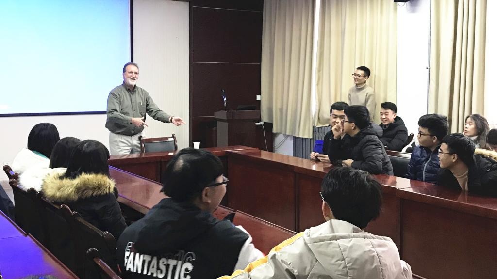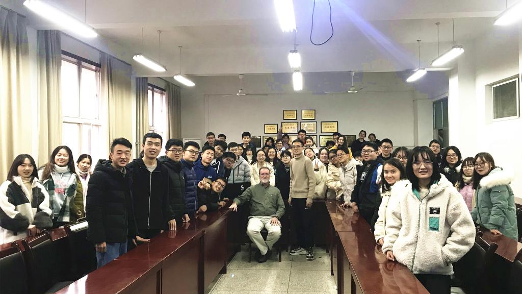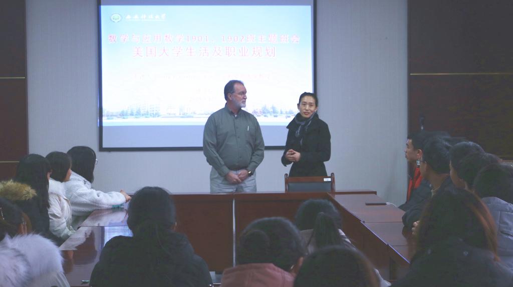 12月31日下午,太阳成tyc122cc数学与应用数学1902班班主任刘金瑄邀请公司外聘教授Terry E. Baxter给2019级数学专业两个班开展”美国老员工活及职业规划“主题班会,马哲博士担任翻译,辅导员赵明参加了班会。