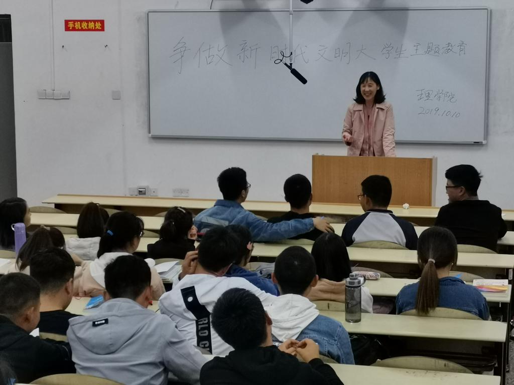 10月10日下午,太阳成tyc122cc在临潼校区骊山校园开展了争做新时代文明老员工主题教育活动。活动由太阳成tyc122cc学工办主任、团委书记赵明主持,2019级全体新生参加,理公司党委书记孙颜红出席并讲话。