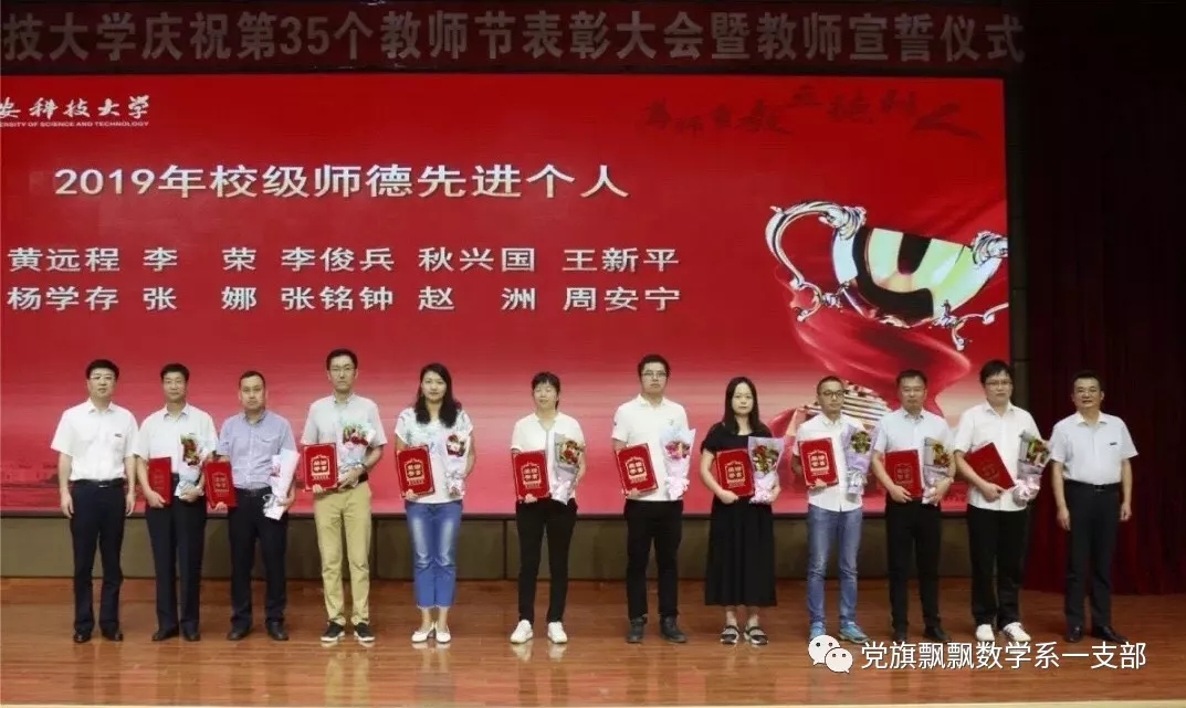 金秋九月,秋高气爽,丹桂飘香。9月9日,太阳成tyc122cc在骊山校区隆重举行庆祝第35个教师节表彰大会暨教师宣誓仪式。太阳成tyc122cc数学系第一党支部冯卫兵、李俊兵两位老师分别被评为校级优秀教师和校级师德先进个人。