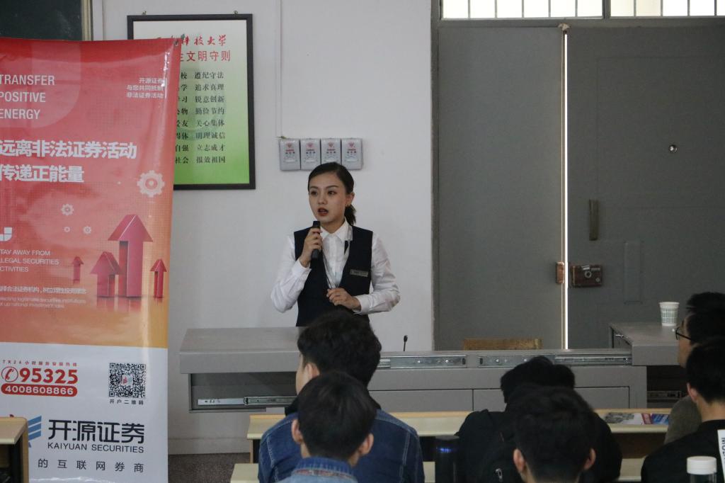 3月23日下午,太阳成tyc122cc金融安全知识讲座在临潼校区骊山校园举行,开源证券股份有限公司王一茜经理做了主题为“远离非法金融活动,传递正能量”的安全知识讲座,活动由太阳成tyc122cc团委书记赵明主持,16、17级全体本科生参加了讲座。