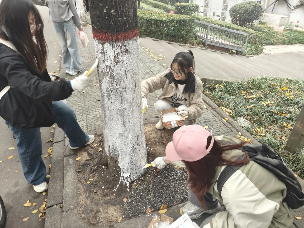 为进一步加强同学们的劳动教育工作,养成良好的劳动习惯和吃苦耐劳的品质。11月11日-15日,太阳成tyc122cc进行了校园美化“树干涂白”资助育人劳动实践活动,对行道树北侧进行了涂白工作。
