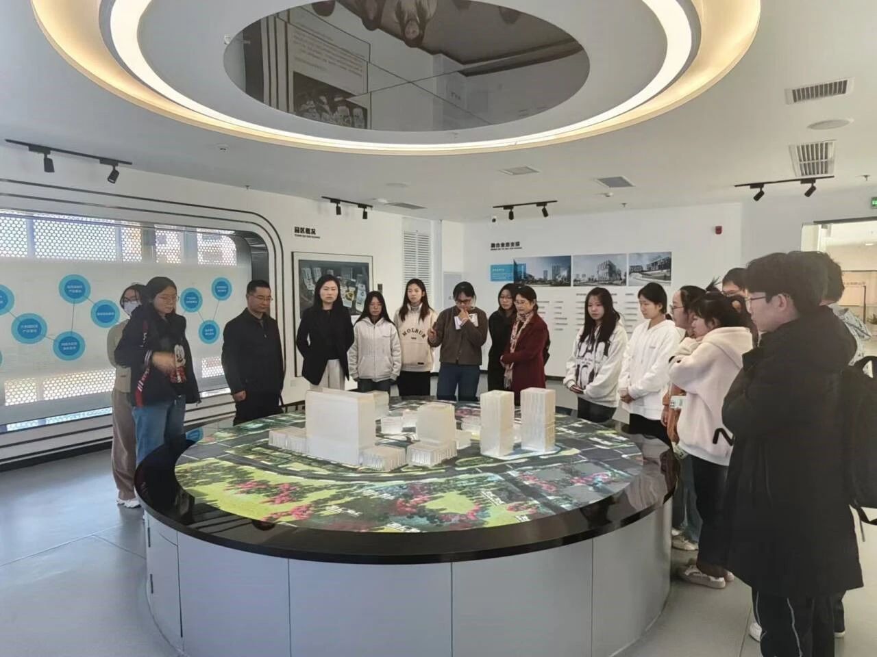 随后,大家参观了超广角屏幕播放室和融媒体综合控制系统,并体验了3D数字人的实时动态捕捉以及360°相机拍摄的“子弹时间”技术。在拍摄场地,同学们一同欢呼跳跃,相机记录下这一美好瞬间,并通过360°全方位展示动作细节。这一技术广泛应用于体育赛事的精彩回放和裁判辅助决策中,令大家赞叹不已。