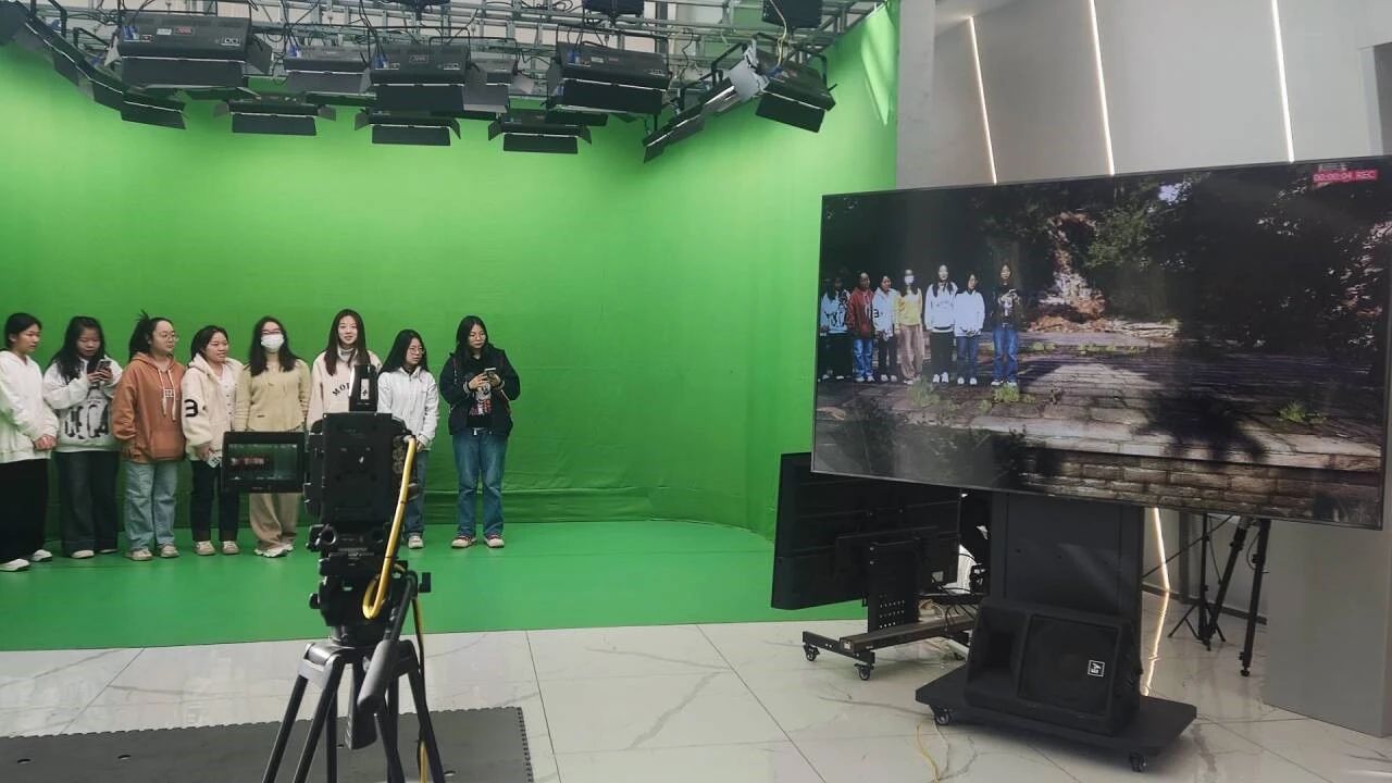 下午2点,师生一行抵达陕西融媒体中心。工作人员热情介绍了中心的基本情况,在他们的引导下公司师生亲身感受了最新融媒体科技带来的冲击。活动伊始,大家首先体验了虚拟制片系统,在绿幕室中,通过VR技术将人物实时融入虚拟场景中,同学们上一刻还身处演播室,下一刻便可“穿越”至巍峨山岭或极地冰川,切身感受新媒体技术带来的神奇魅力。