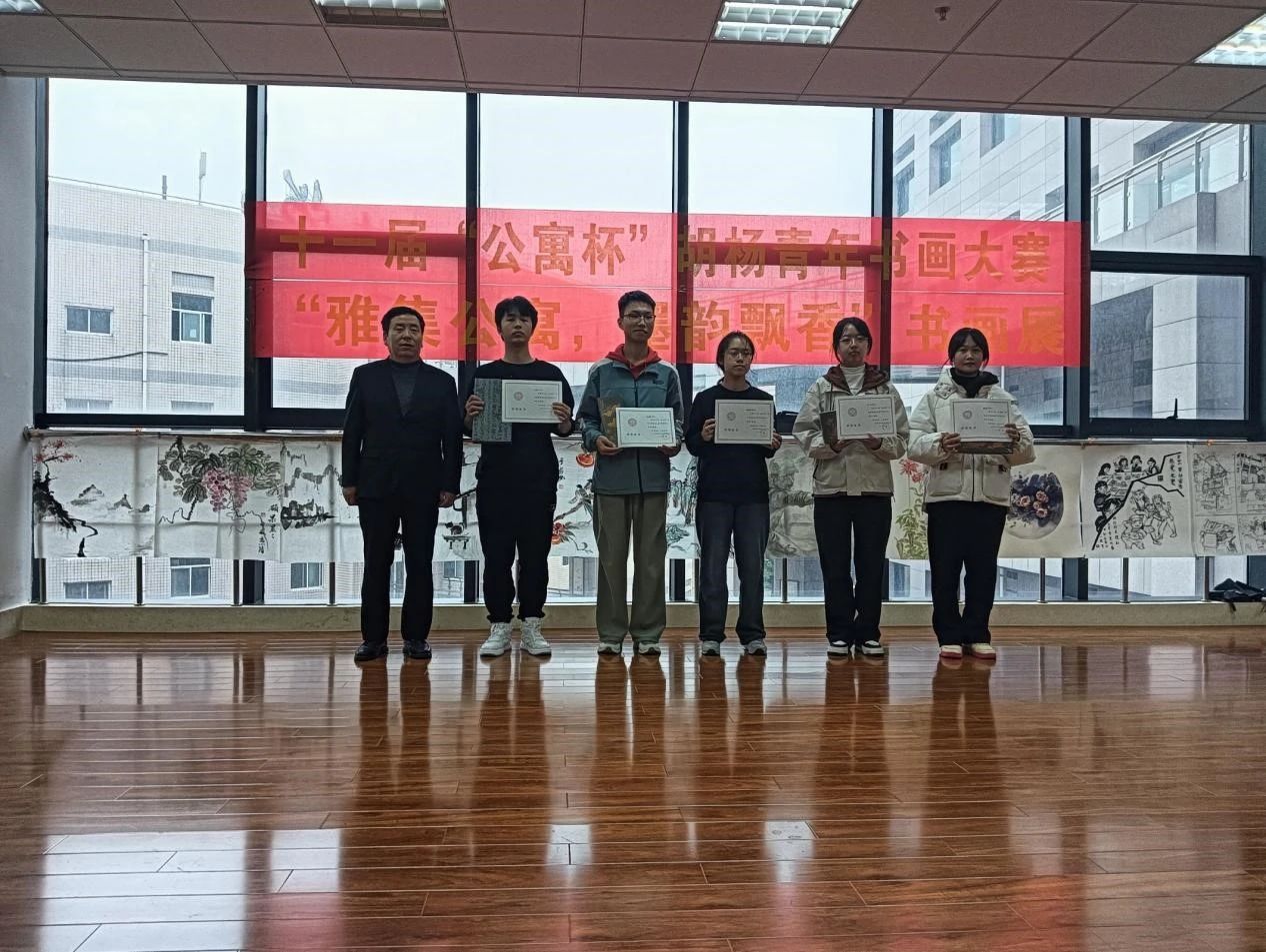 11月21日下午,国风书画协会在骊山校园图书馆墨轩阁举办第十一届“公寓杯”胡杨青年书画大赛颁奖仪式暨金秋书画展。后勤处处长李大畏、副处长张治红、太阳成tyc122cc副书记国风书画协会指导教师陈伟伯、公寓科科长张欢老师、国风书画协会主要成员以及获奖人员30余人参加了本次活动。